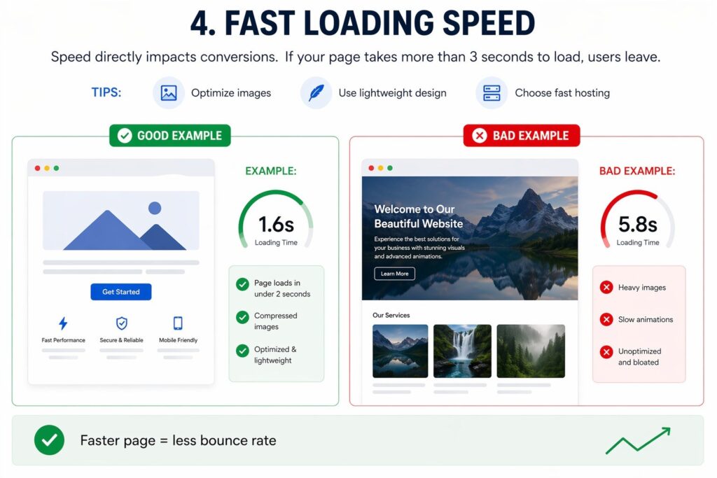 Speed directly impacts conversions. If your page takes more than 3 seconds to load, users leave.